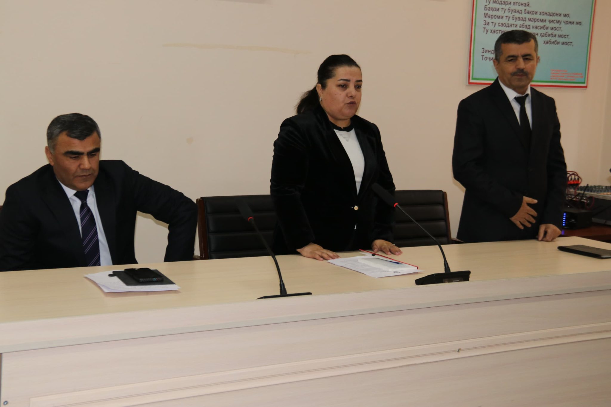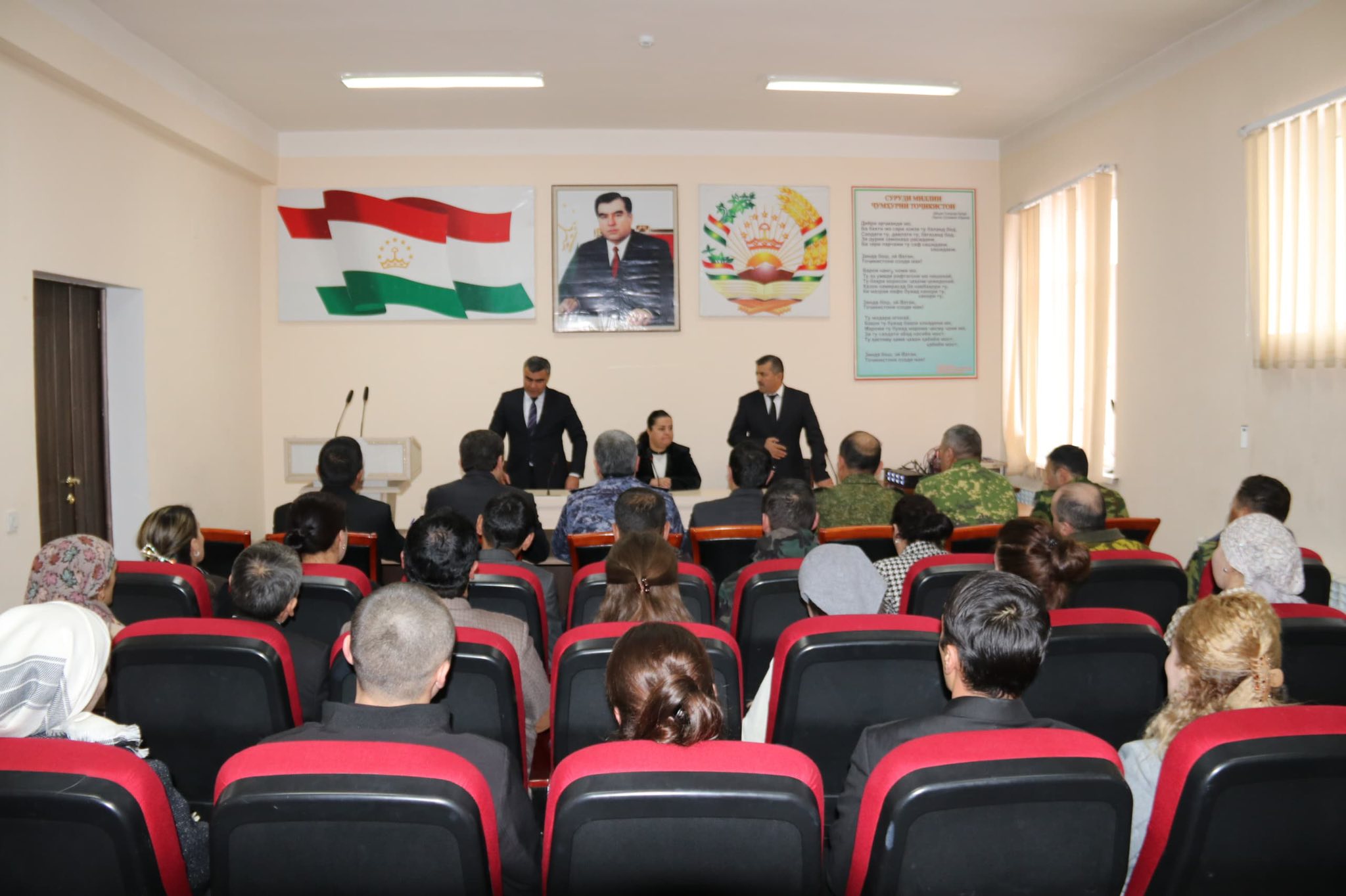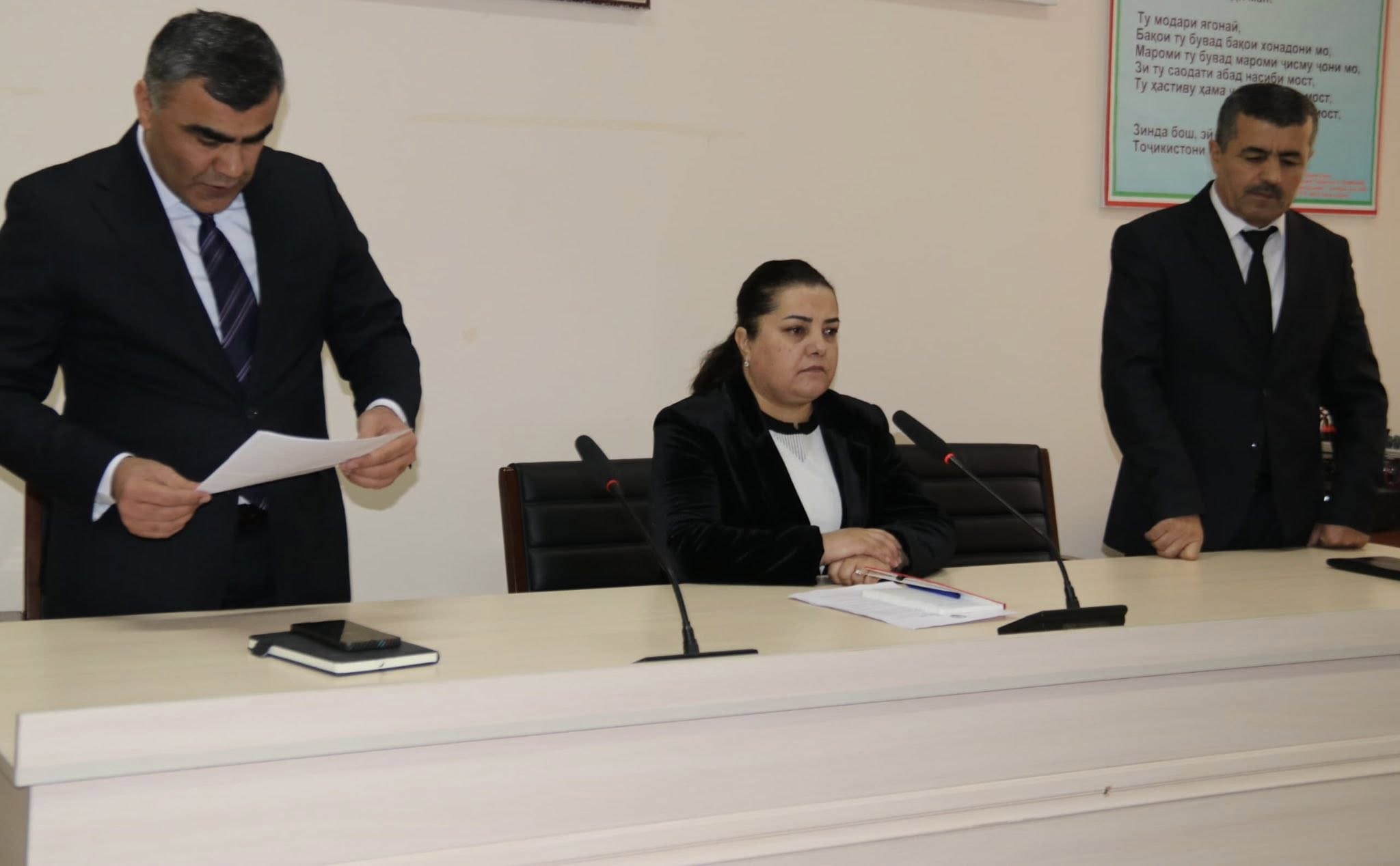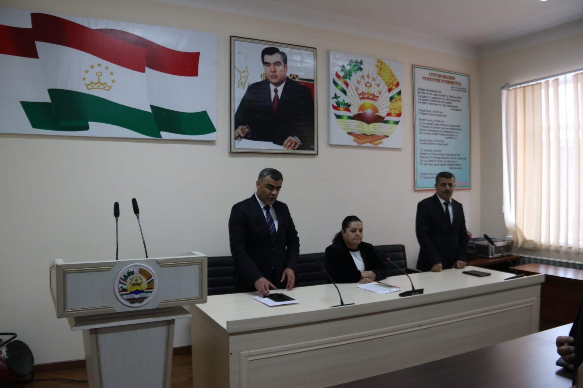 Инчунин Курбанбаев Жунусбек, ки бо розигии хатии Президенти Ҷумҳурии Тоҷикистон муҳтарам Эмомалӣ Раҳмон таъин шуданд, ба аҳли нишаст муарифӣ гардида, раиси ноҳия ба собиқ раиси суди ноҳия Каримӣ Акбаралӣ барои фаъолияти пурсамарашон дар таъмини волоияти қонун, саҳмгузорӣ дар корҳои ободкориву созандагӣ изҳори миннатдорӣ намуда, барои шахсони навтаъин мувафақияту бурдбориҳо дар фаъолияташон баён намуда, қайд карданд, ки таъин ба мансабҳои болозикр нишона аз боварии махсуси роҳбари давлат мебошад ва ҳар як шахси масъул вазифадор аст, ки барои арзанда будан ба чунин бовариҳо дар таҳкими сулҳу ваҳдати миллӣ, истиқлолияти комил ва ободит ватани азиз саҳмгузор бошанд.